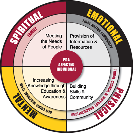 To help guide our development process, a model was created that signified how a northern response to PDA could possibly unfold. At the outer circle, the four directions which recognize our spiritual, mental, emotional, and physical natures encompasses all that we do.